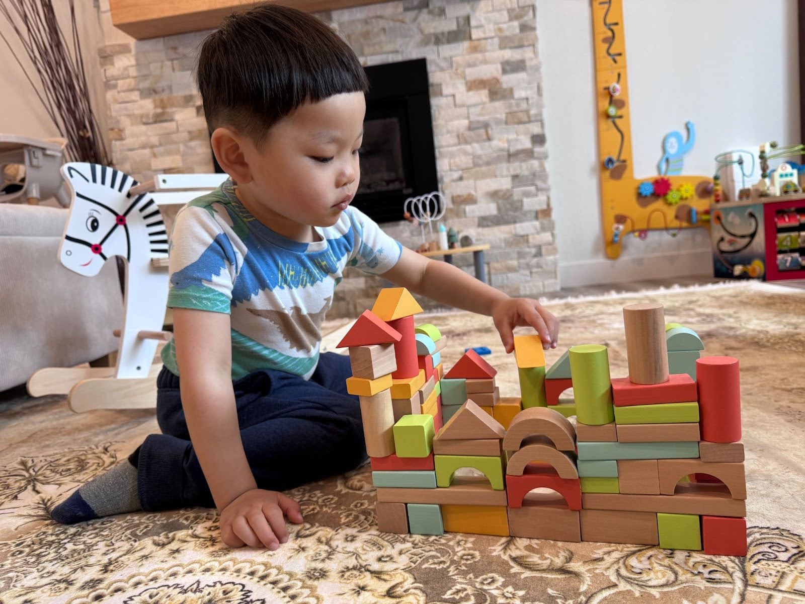 - A toddler might focus on stacking cylinders, mastering hand-eye coordination through repeated practice.